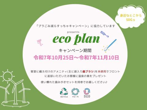 このたびのご宿泊で、お部屋で提供するアメニティのうち、袋入り歯ブラシを未開封の状態でフロントにお返しいただいた方全員に、当宿舎オリジナルの温泉の素1個をプレゼントいたします。